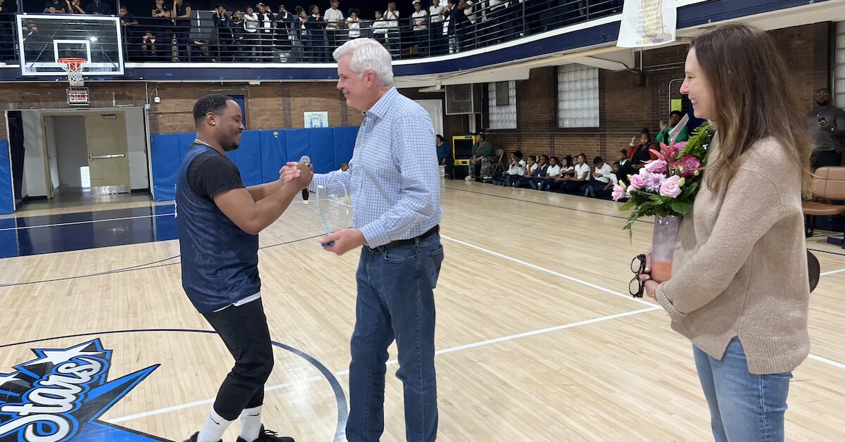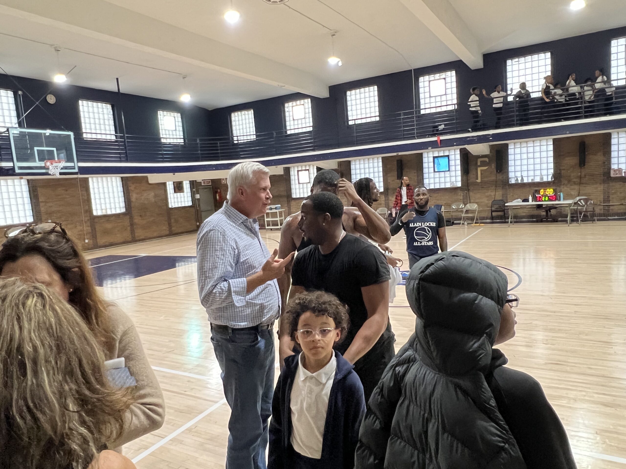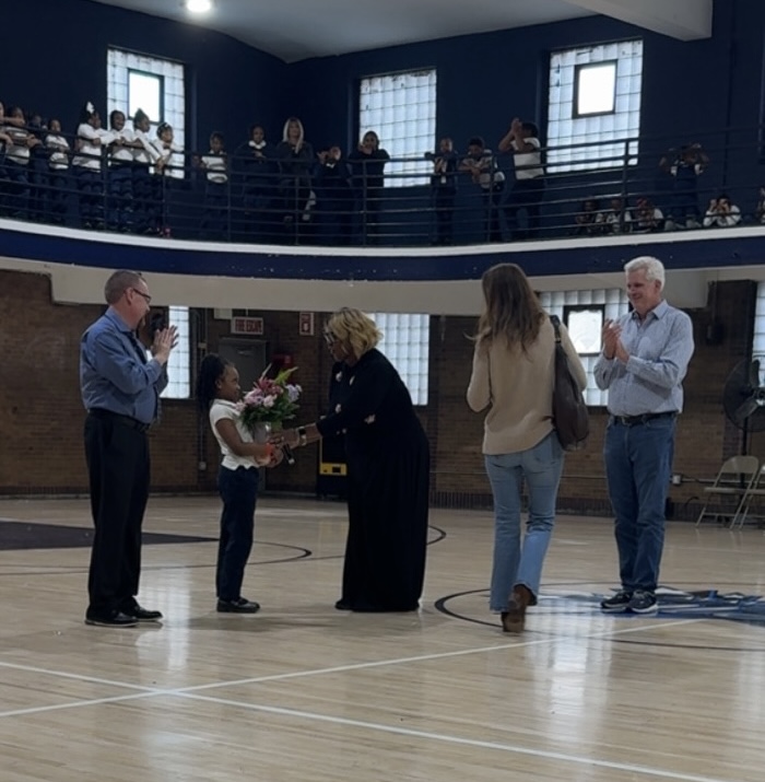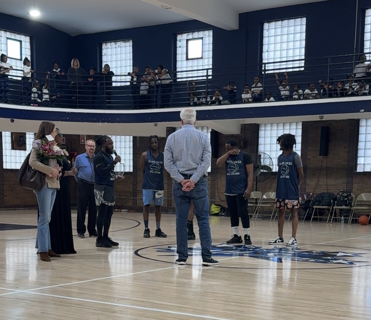 Last week at school, we surprised our former, longtime Alain Locke board member, Bradley Sullivan, and his wife, Paige, to thank them for the many years of support they have given to our Alain Locke All-Stars. We also presented Brad with an award in recognition of his work and support of our Alain Locke basketball program over the years.